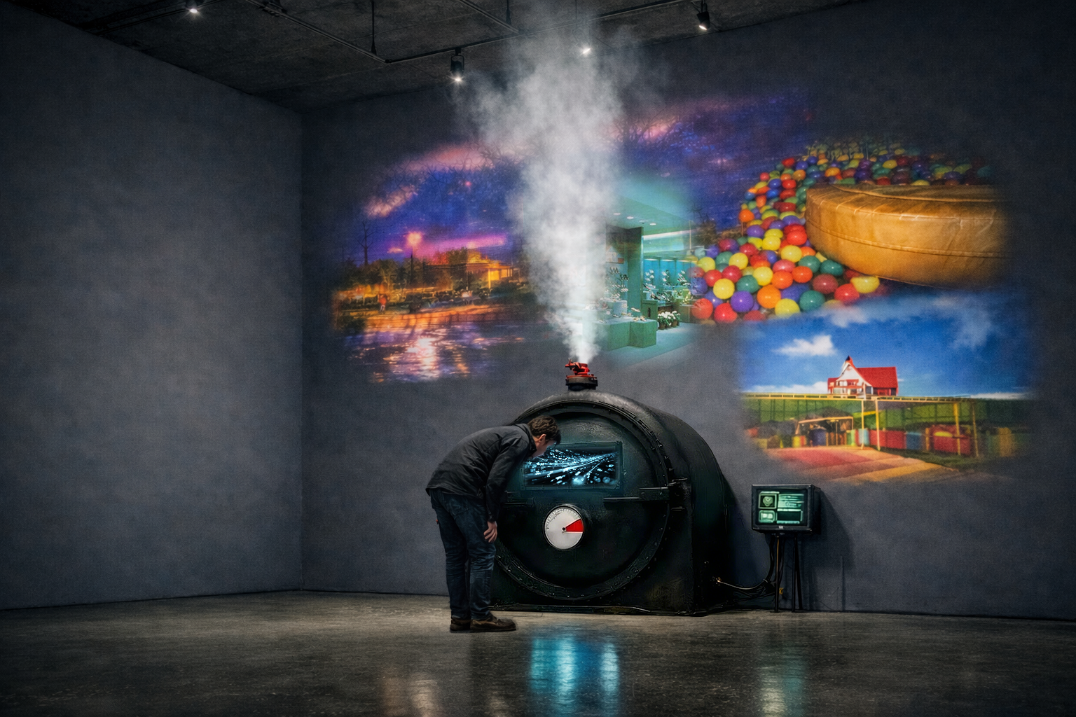 At its center stands an industrial pressure tank that accumulates real-time data about contemporary speed, anxiety, and information overload. As “pressure” rises, the system releases bursts of projected images and sound — not steam — forming fleeting nostalgic landscapes composed of real archival photographs and AI-generated pseudo-memories.